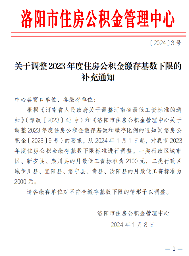 近日,洛阳市住房公积金管理中心发布《关于调整2023年度住房公积金缴存基数下限的补充通知》。