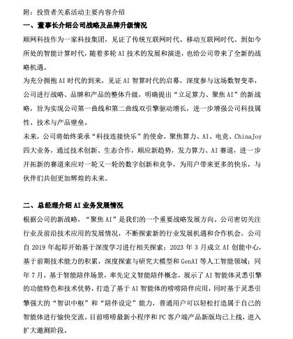 为充分拥抱AI时代的到来,见证AI智算时代的启幕,深度参与这场数智变革,公司进行战略、品牌和产品的整体升级,明确提出“立足算力、聚焦AI”的新战略,旨为实现公司第一曲线和第二曲线双引擎驱动增长,进一步增强公司科技属性、技术与产品壁垒。未来,公司将始终秉承“科技连接快乐”的使命,聚焦算力、AI、电竞、ChinaJoy四大业务,通过技术创新、生态合作,顺应新趋势,发力算力、AI赛道,进一步开拓新的赛道来应对一轮又一轮的数字创新和竞争,为用户带来更多的快乐,与伙伴们共创更加辉煌的未来。