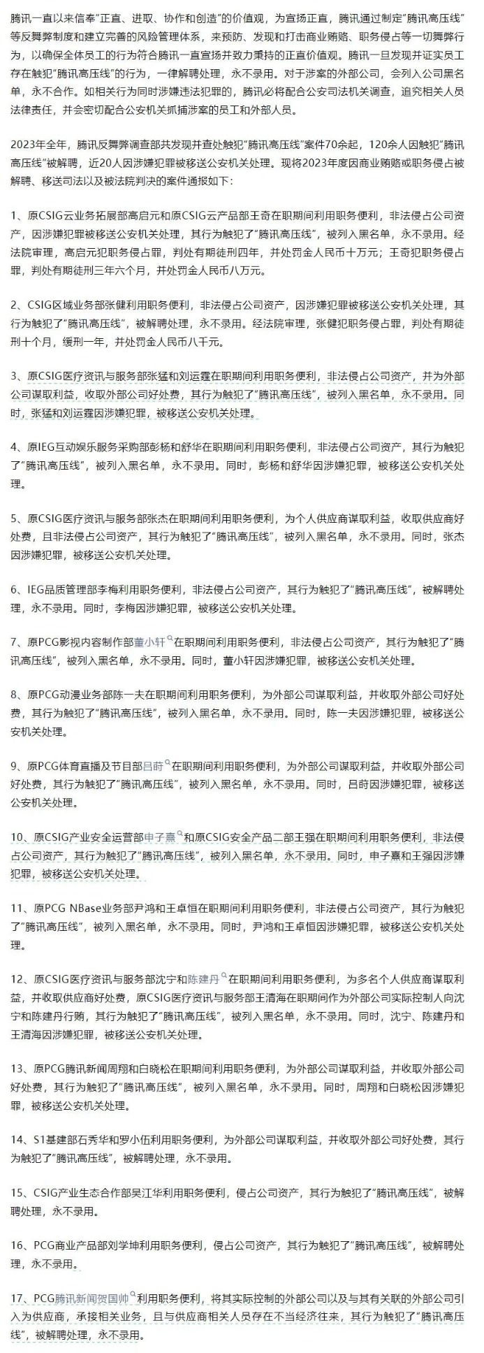 另外,来自腾讯的一则消息也引发关注。据腾讯2日通报,2023年全年,腾讯反舞弊调查部共发现并查处触犯“腾讯高压线”案件70余起,共有120余人因触犯“腾讯高压线”被解聘,近20人因涉嫌犯罪被移送公安机关处理。