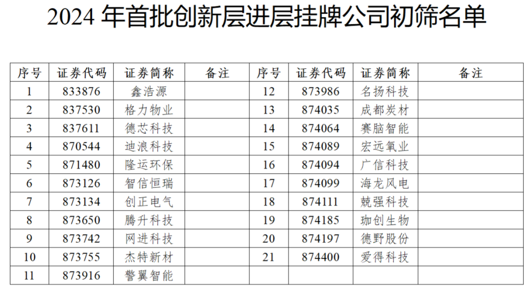 全国股转公司表示,3月1日启动了2024年创新层进层实施工作,经初步测算、自查核查、初筛等程序,全国股转公司于3月8日发布了2024年首批创新层进层挂牌公司(以下简称首批拟进层公司)初筛名单,共计21家公司拟调入创新层。