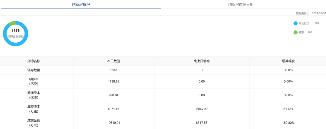 根据全国股转公司官网信息,目前新三板创新层挂牌企业总数为1875家,其总股本为1738.89亿股,流通股本为990.94亿股;其中,采取集合竞价的有1692家,采取做市交易的有183家。